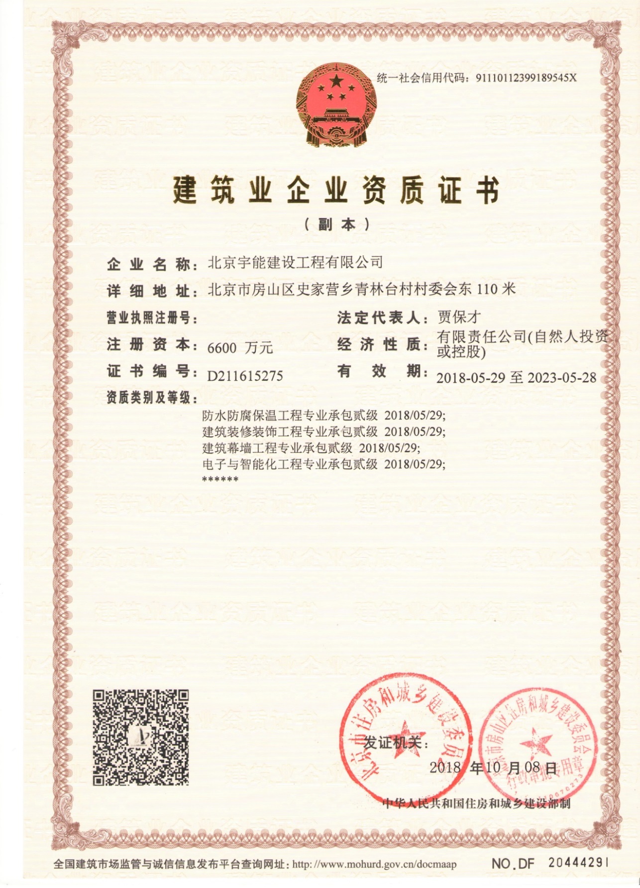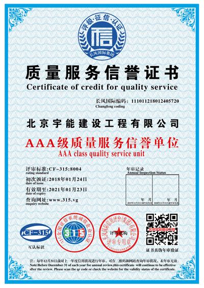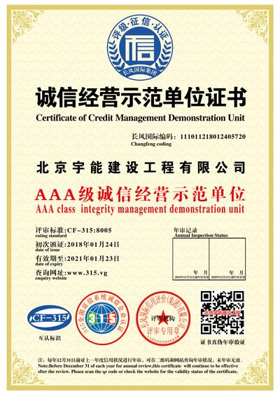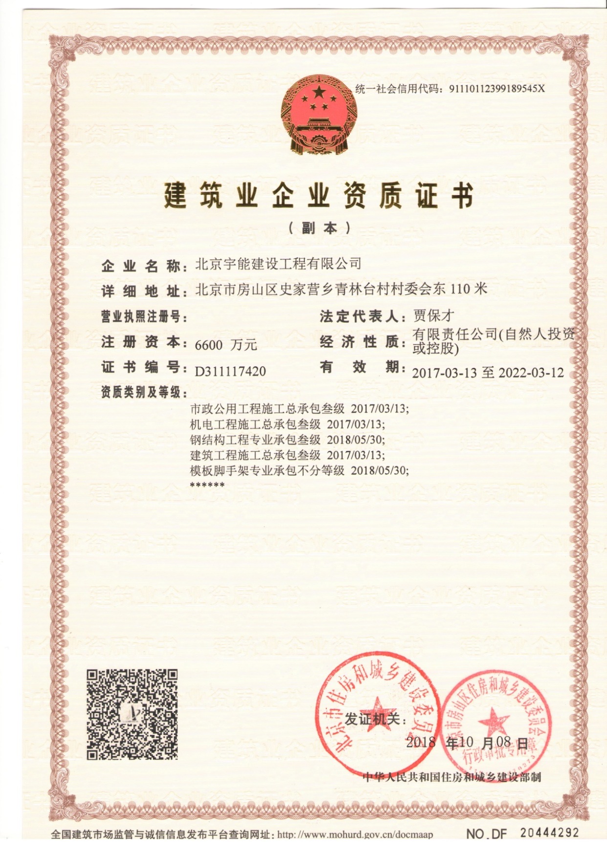 北京宇能建設(shè)工程有限公司成立于2014年5月16日,前身是北京博遠(yuǎn)天宇電力科技有限公司,注冊(cè)資金6600萬(wàn)元。具有《市政公用工程施工總承包叁級(jí)》、《機(jī)電工程施工總承包叁級(jí)》、《建筑工程施工總承包叁級(jí)》、《建筑裝修裝飾工程專業(yè)承包貳級(jí)》、《電子與智能化工程專業(yè)承包貳級(jí)》、《鋼結(jié)構(gòu)工程專業(yè)承包叁級(jí)》、《防水防腐保溫工程專業(yè)承包貳級(jí)》、《建筑幕墻工程專業(yè)承包貳級(jí)》、《模板腳手架資質(zhì)》等;同時(shí)榮獲AAA誠(chéng)信企業(yè)證書、AAA級(jí)誠(chéng)信經(jīng)營(yíng)示范單位、AAA重合同守信用企業(yè)證書、AAA級(jí)企業(yè)資信等級(jí)證書。鑒于公司領(lǐng)導(dǎo)的為人誠(chéng)信,作風(fēng)良好,經(jīng)315全國(guó)征信系統(tǒng)誠(chéng)信企業(yè)認(rèn)證中心頒發(fā)誠(chéng)信企業(yè)家榮譽(yù)證書及誠(chéng)信經(jīng)理人的榮譽(yù)稱號(hào)。